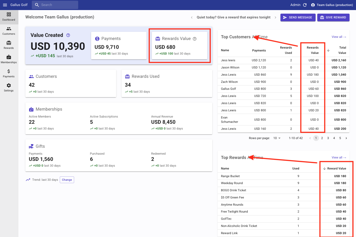 - Top Rewards - In the Top Rewards table lets you sort by either Used or Reward Value. This makes it easy to identify not just which rewards are popular, but which ones are driving the most estimated business value - which aren't always the same thing.