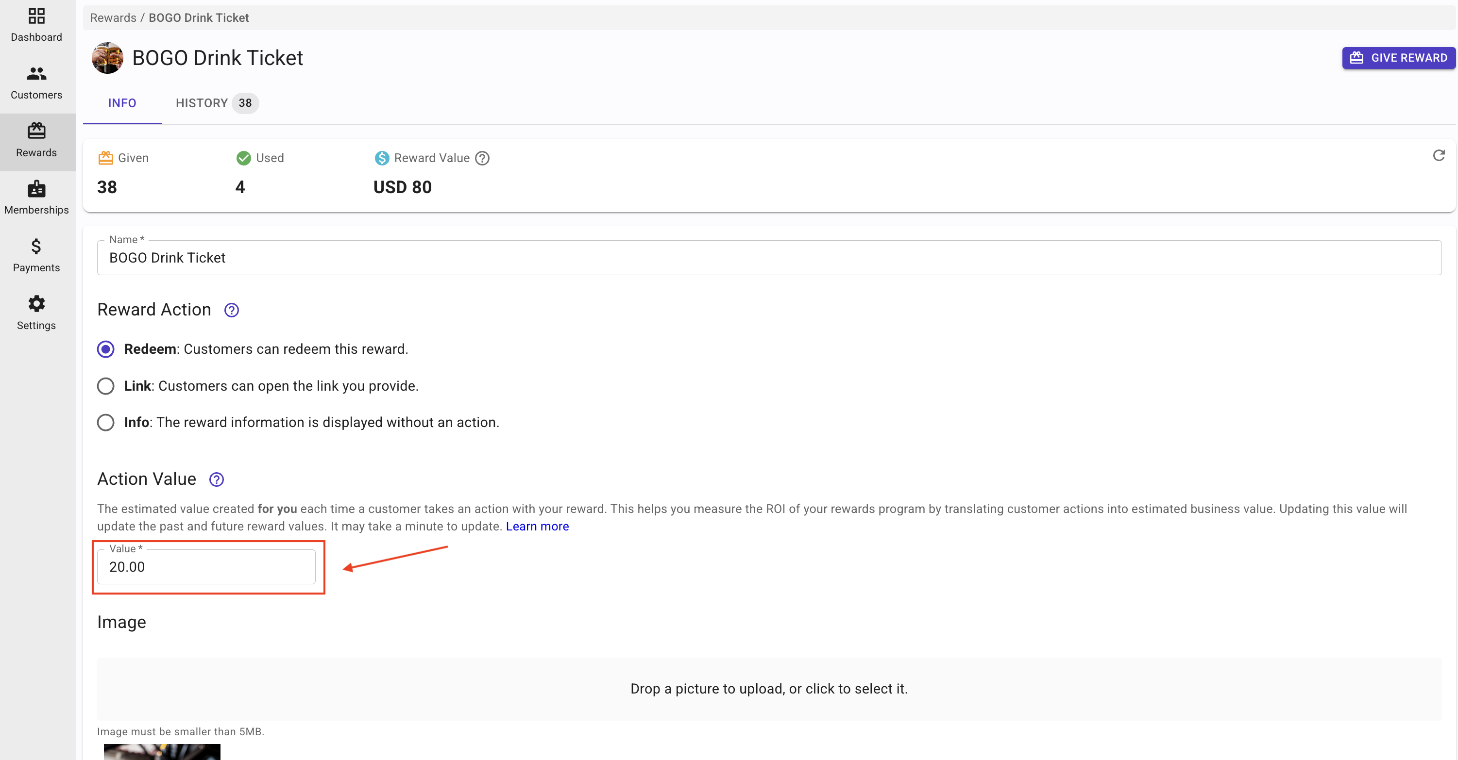 Say you have a BOGO Drink reward. As a business you understand that when this reward is used, a customer typically spends $20 because they purchase another two drinks plus an appetizer (~2 Draft Beers = $8, 1 Appetizer = $12) before they close out. You'd set the Action Value to $20.00, and since 4 customers have already used it, it's generated $80 in total Reward Value.