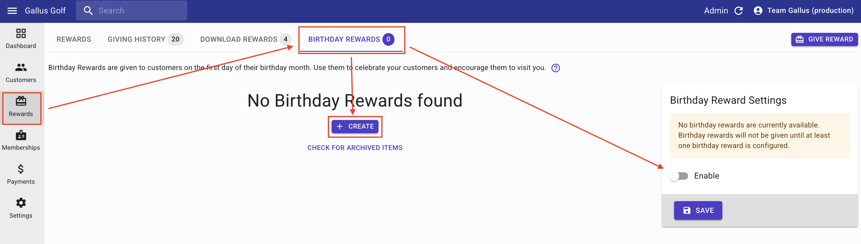 - In the center of the screen, you will see the Create to add Birthday Rewards