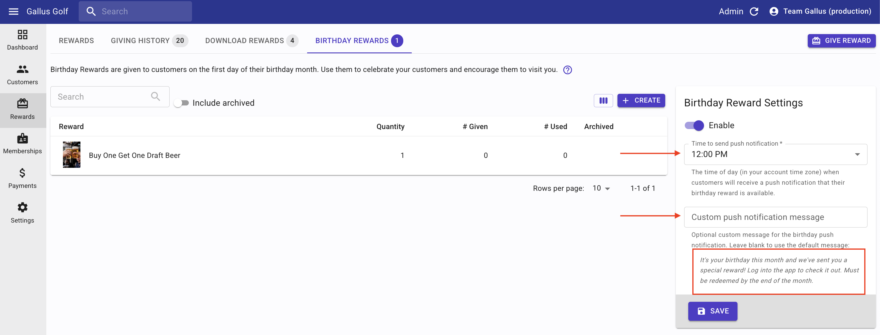 - Toggle on Birthday Rewards Settings to activate the time in which you'll send an automated push notification and what you want to say!