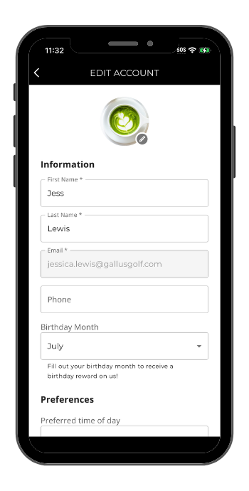 Profile information is pulled directly from Club Prophet. If anything needs to be updated - name, email, account number - it's recommended that the customer contact the pro shop to make the correction in the point-of-sale system or through their account in the Booking Engine. Changes will reflect in the app after the customer signs out and back in.