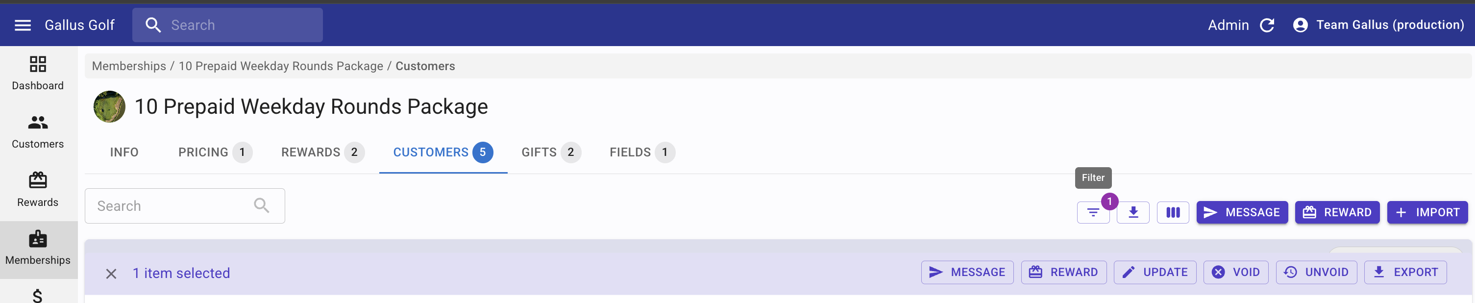 Directly from the Customer's Tab on Memberships you can 'filter' to send messages, apply one off rewards, bulk update specific information, void or unvoid memberships and export.
