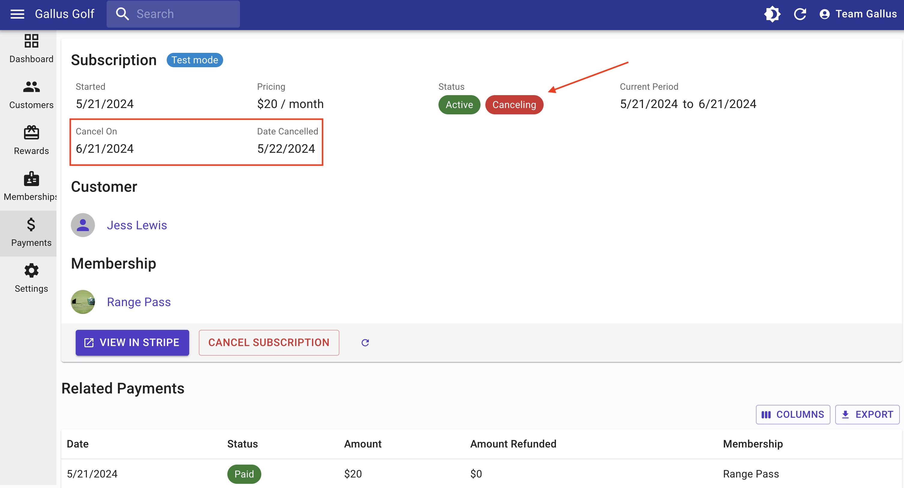 Now go back to the Customer Subscription page and you'll see there is a Canceling status now tied to their record.