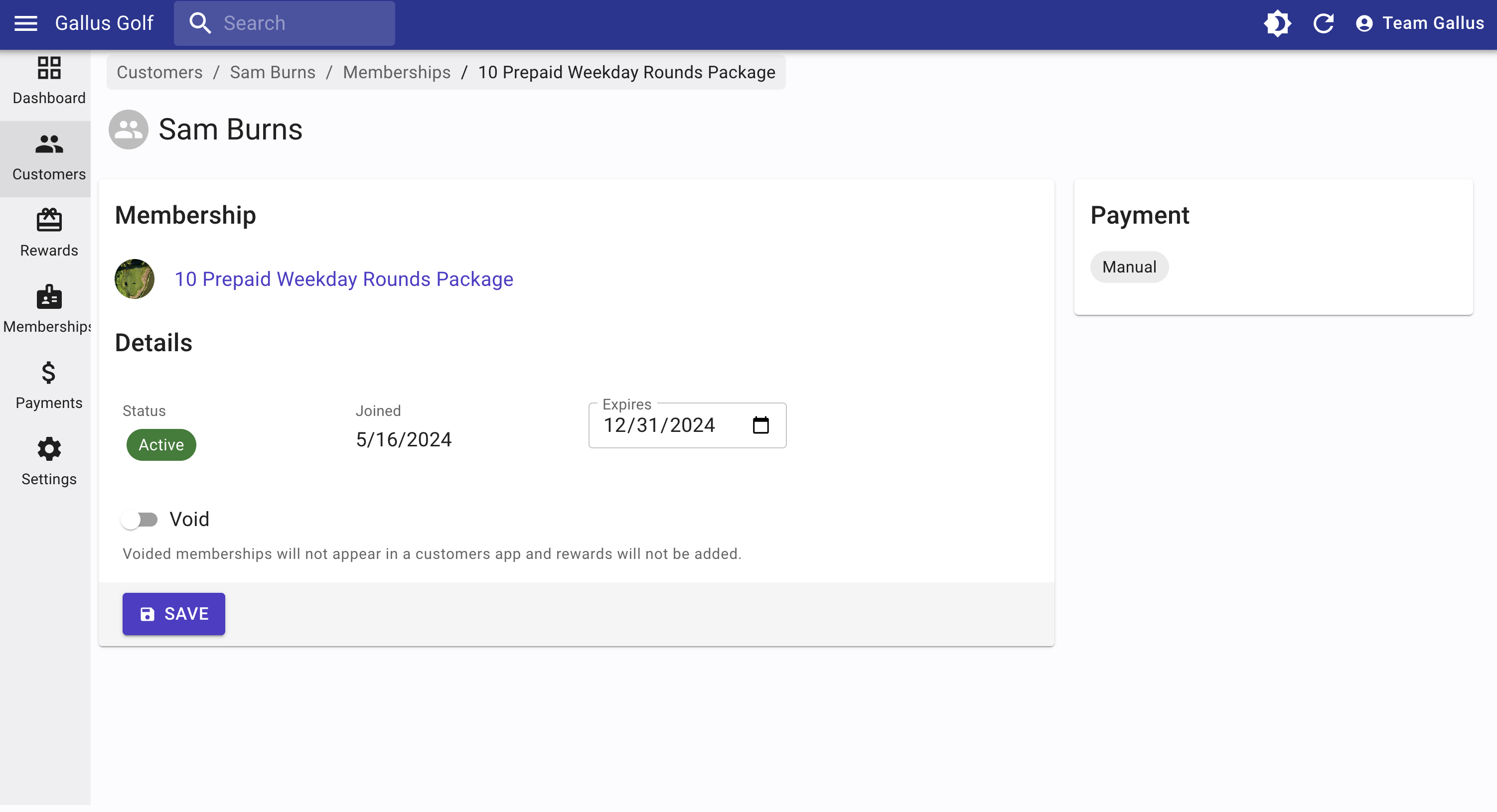 The ensuing page, you can either Void the membership or adjust the Expiration date.