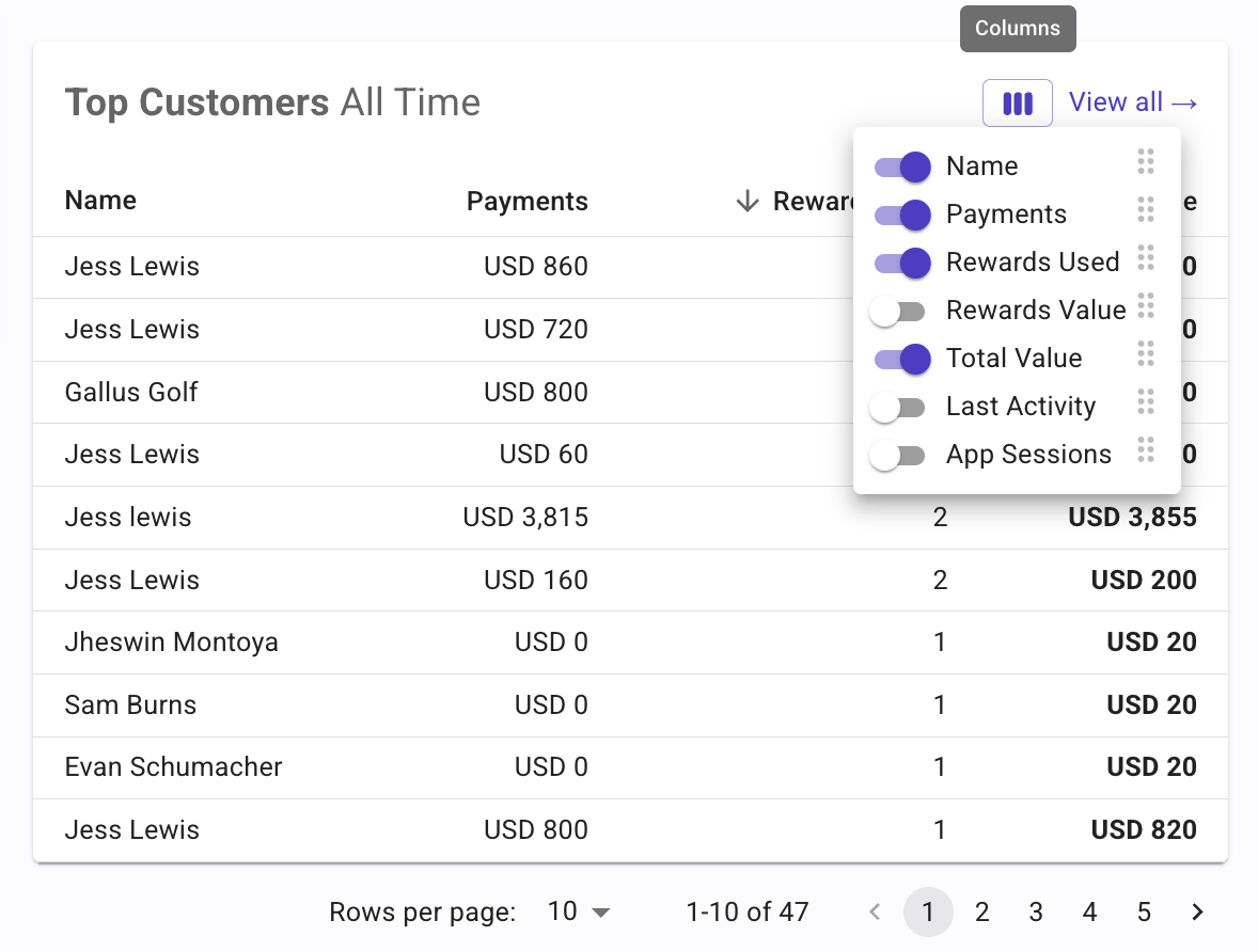 With the new Columns button you can decide which fields you want to display and in what order. Say you don't have any memberships set up and are not using our Rewards Action Value. Toggle those off and toggle on App Sessions and Last Activity date to see who is heavily engaged with your app. You can also page through all customers using the navigation controls at the bottom of the table (rows per page selector and page numbers) or click View all → to access the full customer list.