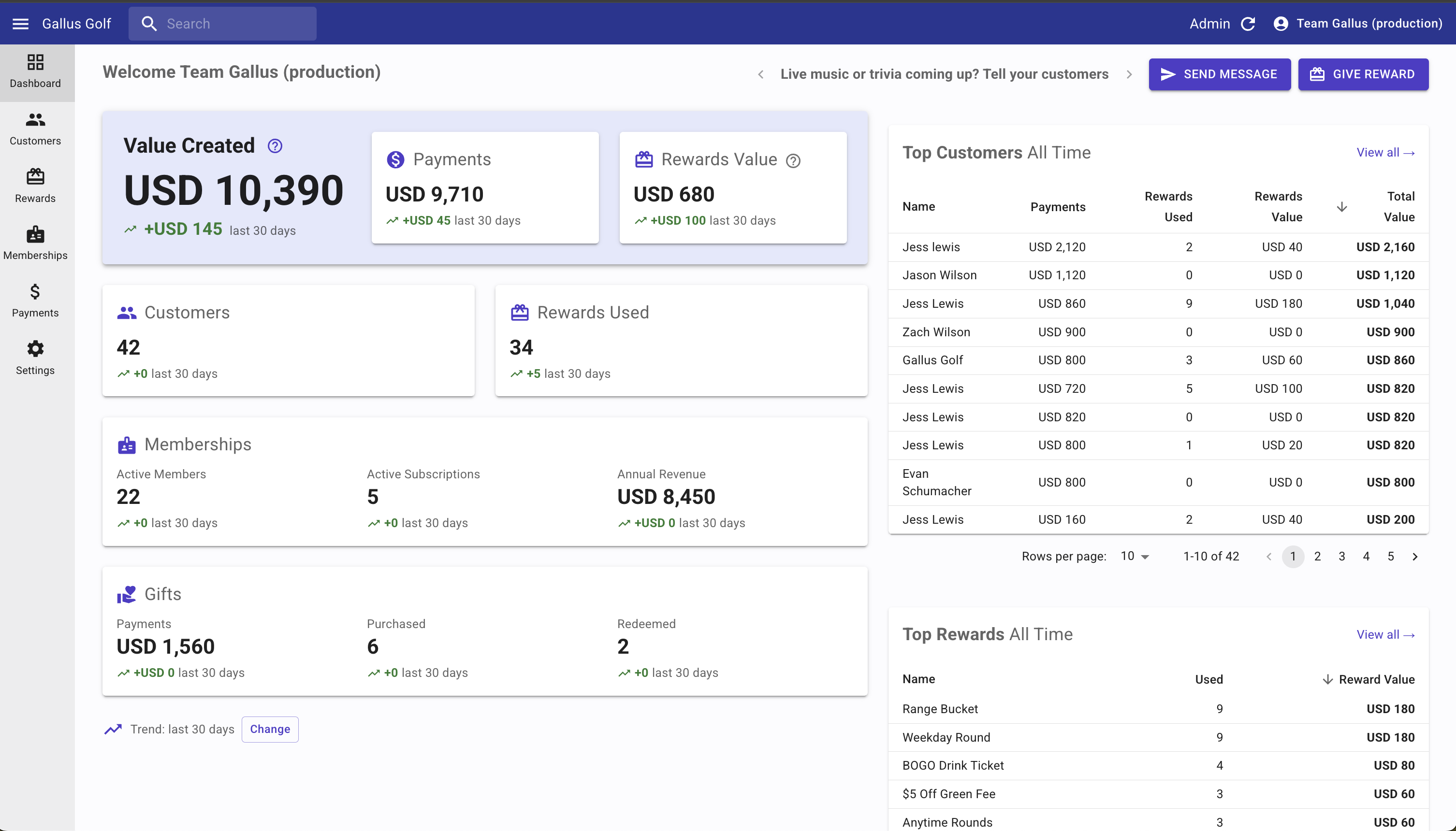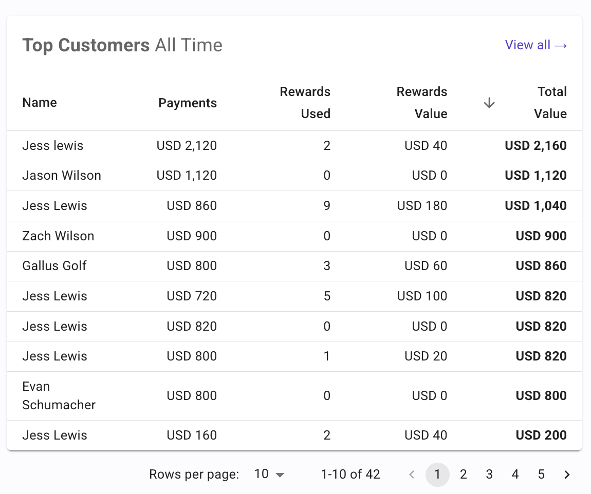 The Top Customers panel ranks customers by Total Value (Payments + Rewards Value) on an all-time basis. But you can sort by each Column Header displayed. Each row displays: