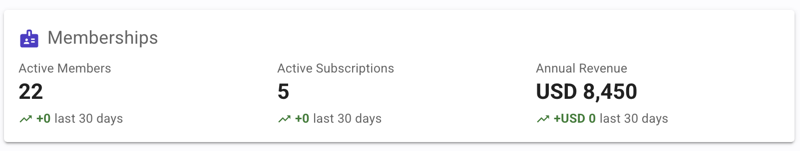 The Memberships section provides a snapshot of your membership program with three key figures: