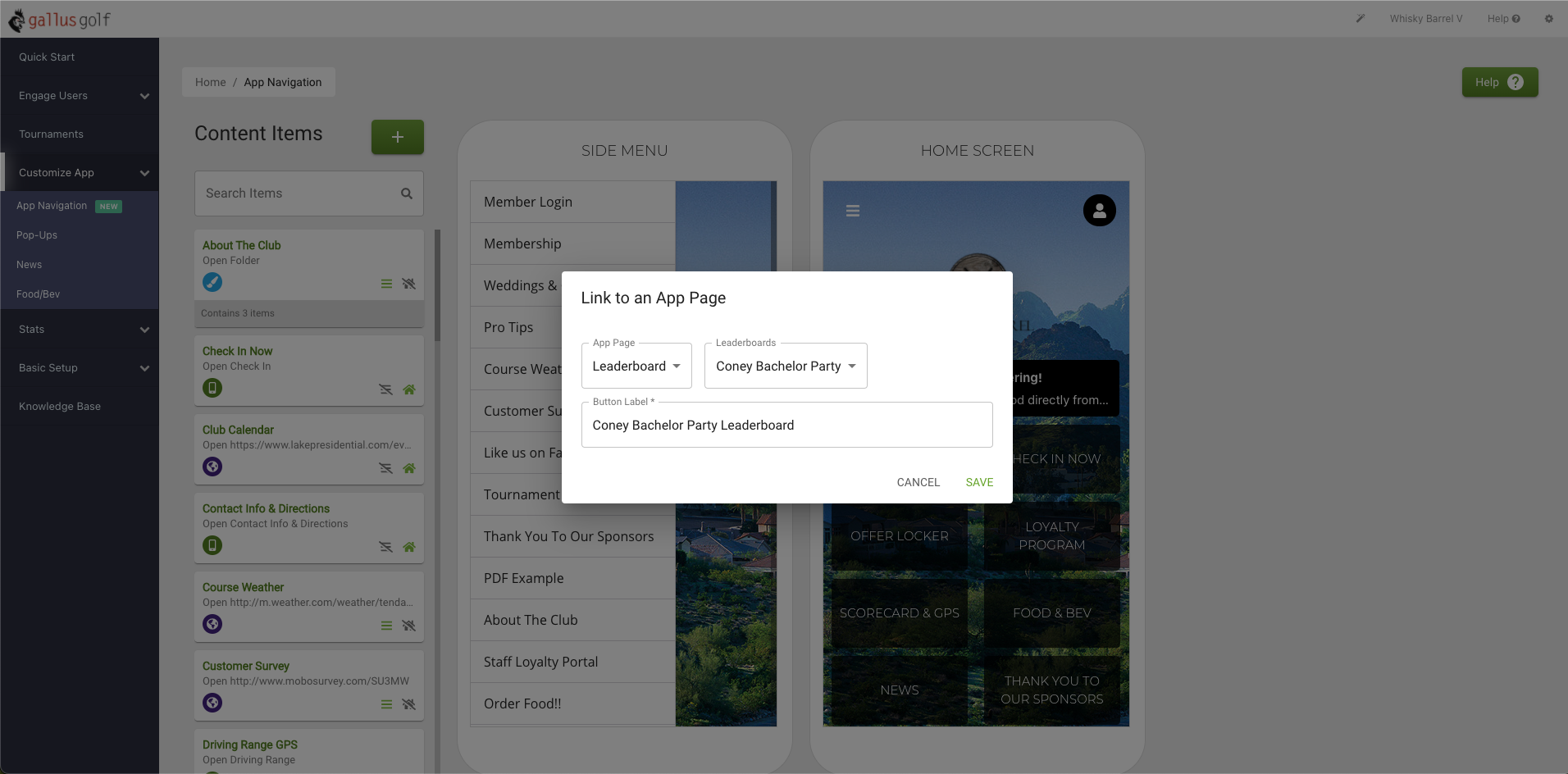 Este artículo proporcionará detalles sobre la parte de navegación de aplicaciones de una aplicación móvil Gallus Golf, que incluye configuración tanto para la pantalla de inicio como para el menú lateral.