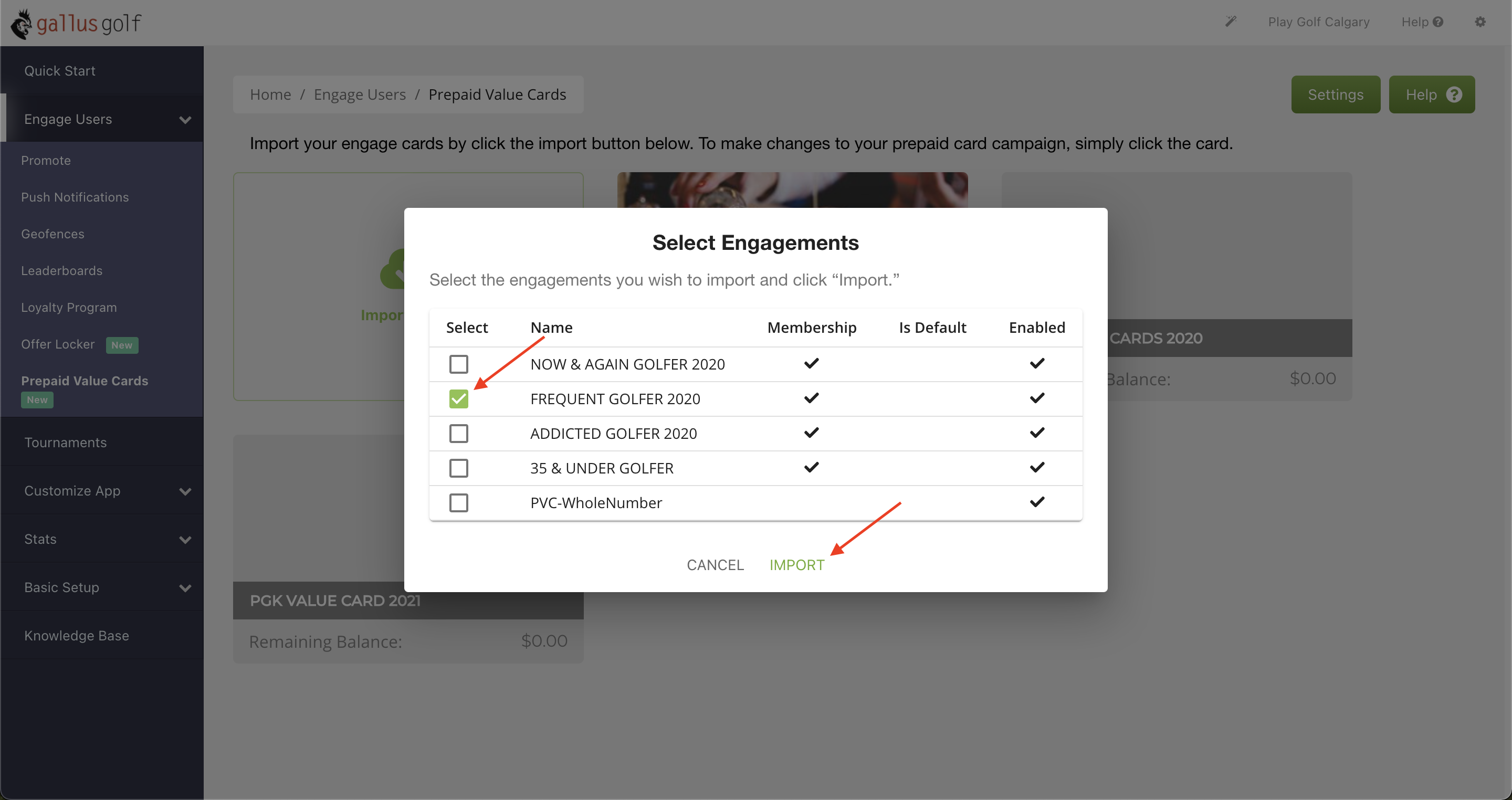 - Sur la page qui suit, cliquezImporter des cartesen haut à gauche, puisImportàConnectez-vous à votre compte Engage.