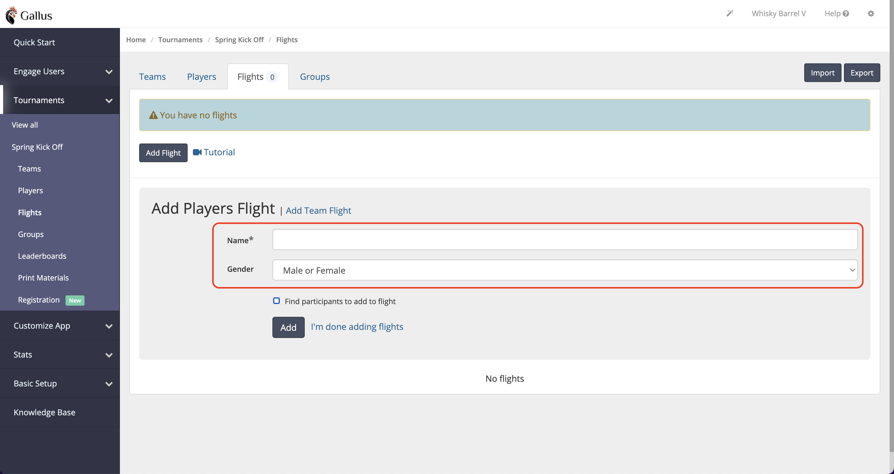Lorsque vous exécutez un tournoi ou une compétition dans leGallus Tournament Software, un sous-groupe de joueurs de l'événement peut avoir besoin de leur propreLeaderboard... Pour ce faire, les administrateurs du tournoi devront configurer des vols. Il s'agit essentiellement d'une compétition au sein d'une compétition.
