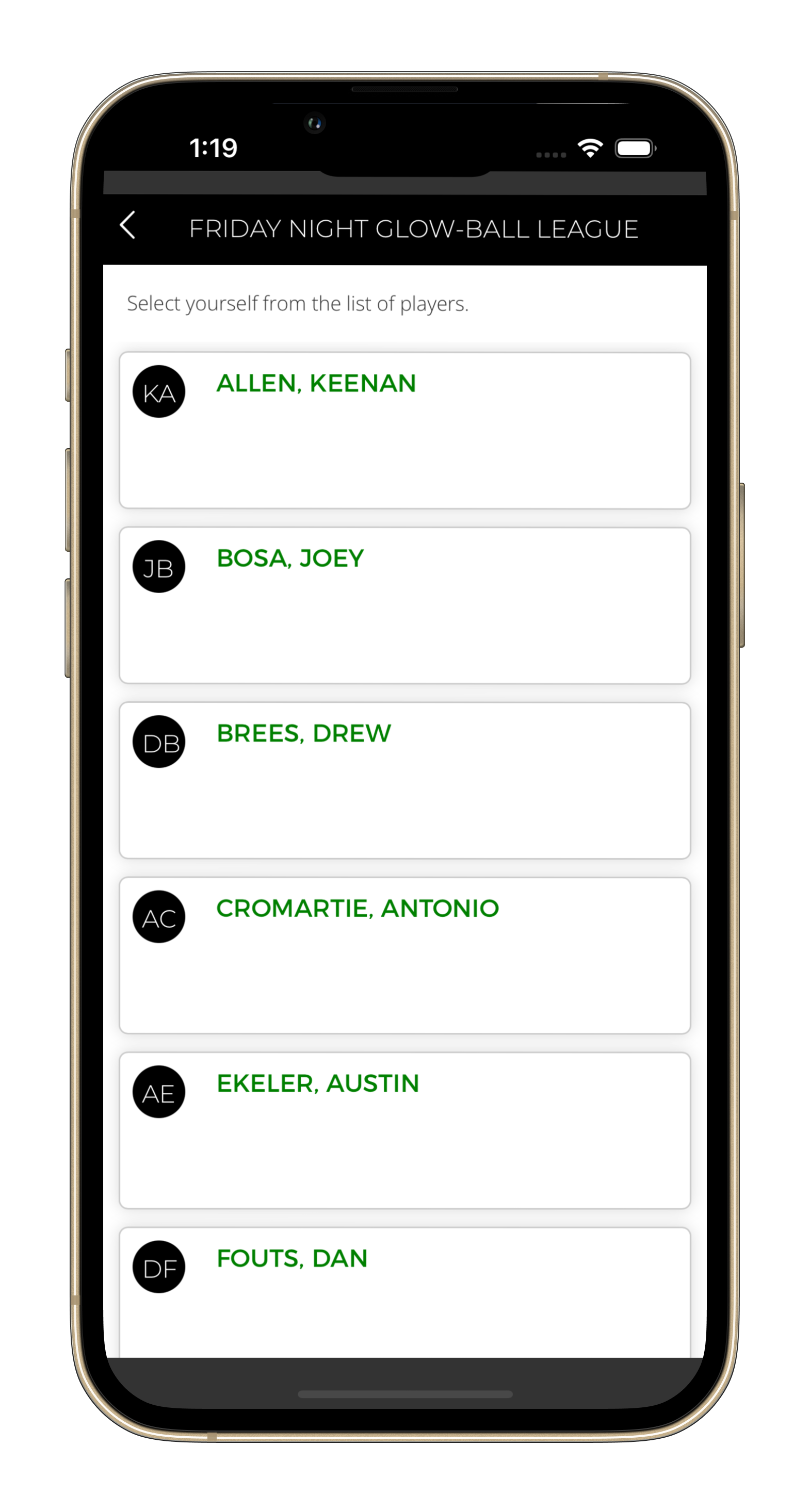 Après avoir suivi le processus précédent, un utilisateur peut appuyer sur le bouton Leaderboard en bas à gauche de la page Scorecard/GPS pour afficher le classement de la ligue en direct.